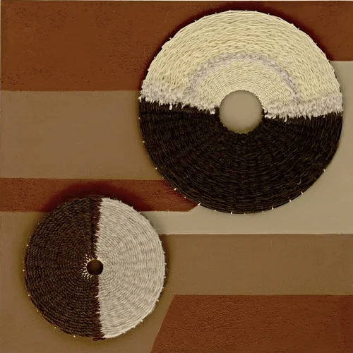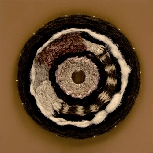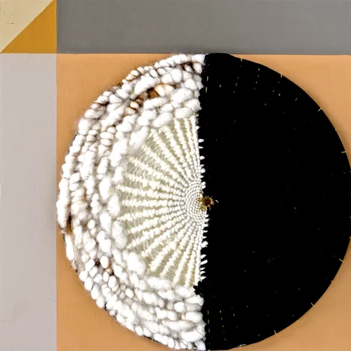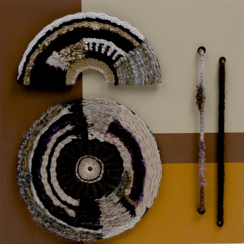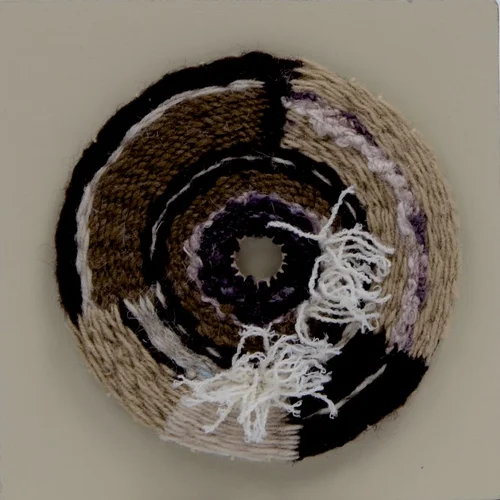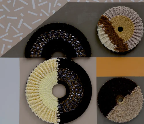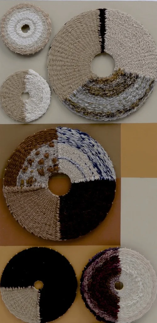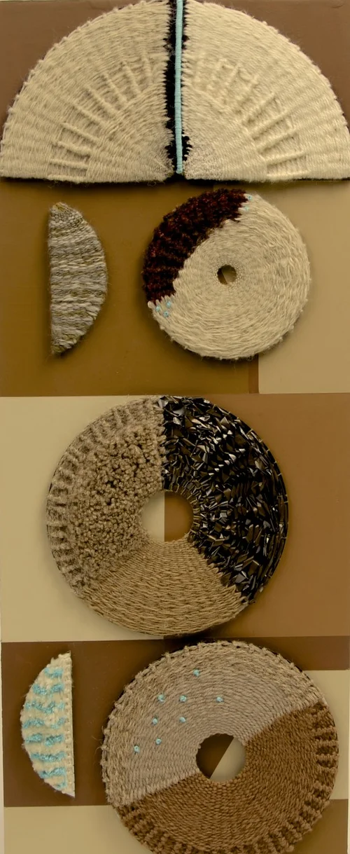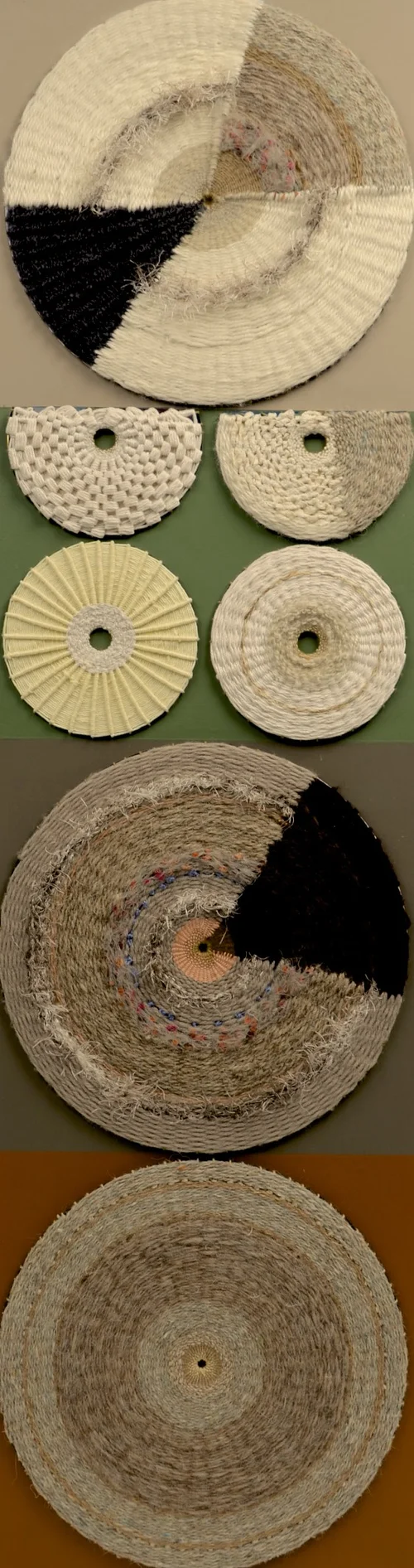 Series of weavings based on agricultural irrigation circles viewed and photographed from airline flight. Materials are reused, repurposed and recycled fibers, paints and looms.